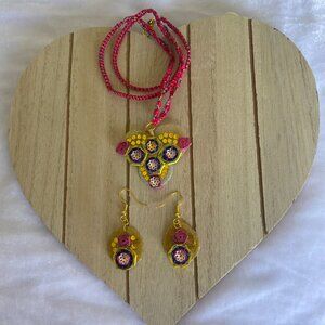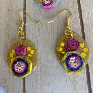 Those are a beautiful handmade jewelry made by a dreamer mother who mainly used quilling paper art as a craft technique. Each piece was carefully crafted rolling manually each paper strips with quilling paper tool, then the shape was given and patiently glued and then add some design details as a shiny, beads, foil etc. At the end of the process the whole piece was carefully coated with polish. Then the entire piece was assembled with jewelry glue (B-7000) on the previously made glitter hot glue base. This base also was coating with polish to protect the piece from heat, water and constant handling. Subsequently, a hole was made in the center of the pendant and then the jewelry material was assembled to give the final touch to the piece.