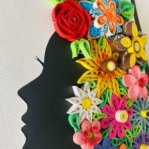 This is a pretty handmade painting woman face made with a curated selection of 13 3D quilling paper flowers and leaves.