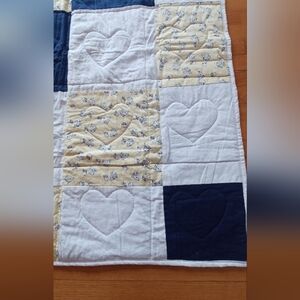 Charming quilt with dog and cat print. Features navy blue, white, and yellow backing colors.