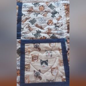Charming quilt with dog and cat print. Features navy blue, white, and yellow backing colors.
