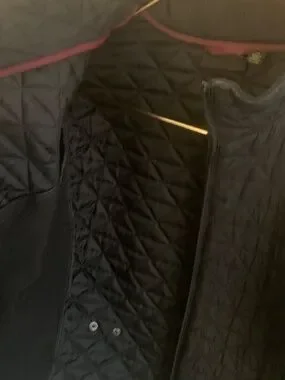 This is a very flattering, softly tailored quilted biker style jacket. Stretch panels on sides for layering room, snaps on back to taper in even more, side pockets, full front zip, water-repellent. Photos don't do it justice.