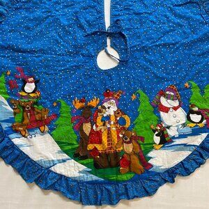 Early 2000s Tree Skirt in blue with Santa and woodland animals.