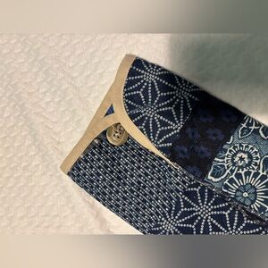 Chic quilted jacket with a hood. Features a blue patchwork design. Great condition. Tag says large, fits more like a medium. See photos of measurements. No fabric tags.