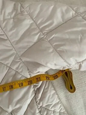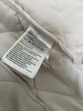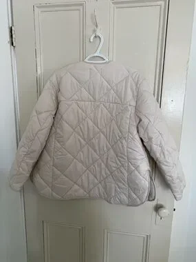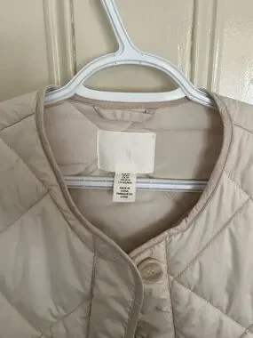 Lightweight quilted puffer shell from H&M. Button-front closure and side pockets. Rounded neckline and relaxed oversized fit, bum covering length. Pearly cool toned beige, really pretty! Marked size XS but is oversized and could easily fit size medium. Pit to pit 22”. Shoulder to hem 27”.