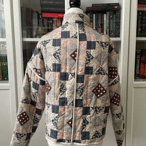 Lightweight quilted jacket with a patchwork print. Soft multicolor palette featuring navy, blush pink, cream and brown. Hook and Eye closure and front patch pockets for easy wear. Comfortable, relaxed fit perfect for layering.