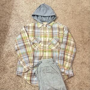 Plaid button-up shirt featuring a gray hood. Perfect for casual wear. A stylish plaid quilted hoodie jacket with soft light padding inside — warm but not bulky.