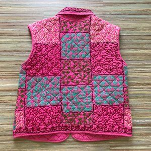 Pink cotton quilted vest has colorful all-over embroidered design on the outer fabric. Shank button front closures with pockets at hips; also has 2 inner pockets. No tags, fabric feels like cotton. The pink color runs when laundered, so separate laundering is recommended. Pre-owned condition: Side seams appear to have been altered - vest fits like a women's medium/large - see below for garment measurements. The pictures show the actual item that you will receive.