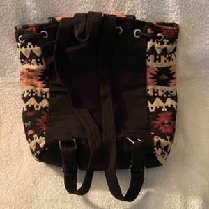 Quilted printed backpack in excellent condition. Front magnetic closure as well as tie string drawstring. 2 front pockets with magnetic closure. Inside has 1 zippered pocket and 2 open compartments. 14” wide x 14” high x 6” deep