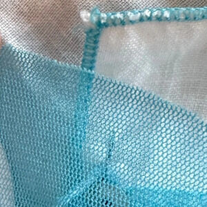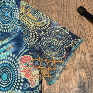 Super unique mesh artsy AOP top from Parisienne brand Quinze Heures Trente. Polyester sheer construction with mixed media aspects of the mesh over layer and cotton asymmetrical accent, with unique button detailing on the front, shoulder, and back. Top is lined with an additional layer of turquoise mesh.