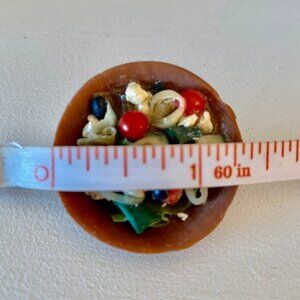 I wish I had more information on this brooch because it's so funny and I love it and its crazy detailed and well made despite the silly subject matter! Veggie pasta bowl brooch, marked "L79" on the back. Great vintage condition. Measures between 1.25-1.5 inches in diameter. Cat friendly, nonsmoking home.