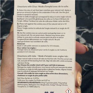 English: Application Start with clean nails and gently push back cuticles to expose nail bed. 2. Size false nails for each finger and toe. 3. Use included applicator to pick up each nail, apply glue to the back of the nail, and spread evenly with the top of the glue nozzle. 4. Place bottom edge of false nail against cuticle and slowly lower onto nail bed. 5. Push and hold applicator with attached false nail firmly to your real nail for 15 seconds for better adhesion. REMOVER: Soak nails in acetone and wipe off loosened product.