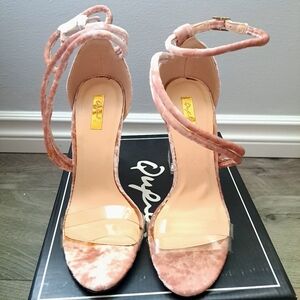 Qupid | Pink crush velvet ~ open toed chunky glitter heel with straps