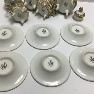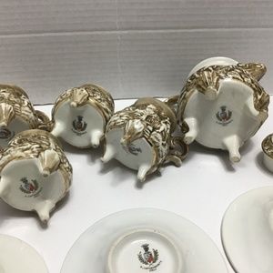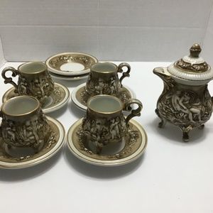 Gold and tan accents with 24K gold trim, exquisite hand crafted porcelain. Cherubs and men/ladies, sculptured handles.