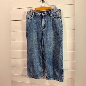 Trendy wide-leg jeans in a light stonewashed blue. Mid-rise fit with five-pocket styling and a clean hem. Easy to pair with sneakers, boots, or sandals for a casual everyday look. Size 28, excellent condition.