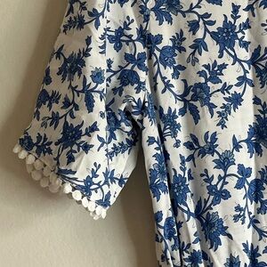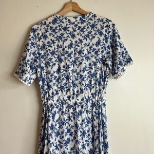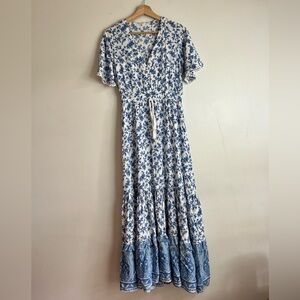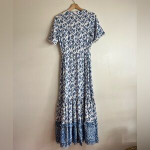 R. Vivimos Blue & White Floral Boho Maxi Dress – Short Sleeve, Tassel Waist, Size S (4/6)
