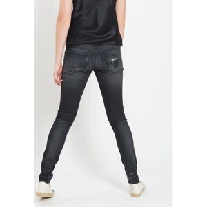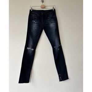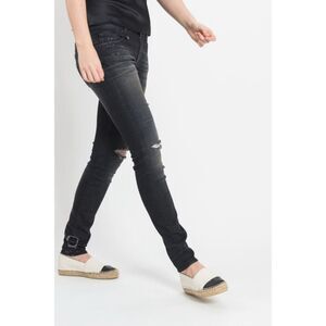 The perfect skinny by R13 featuring a faded black denim wash, shredding at the knee and a black leather detail on the back waistband. 9 rise, 32 inseam, 7 leg opening. Made in Italy.
