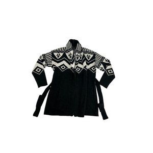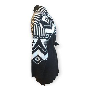 Features: Long sleeve cardigan Shawl collar Wrap front with self-belt Jacquard pattern Color: Black/White Made in Cambodia Fabric Content: 60% cotton, 30% nylon, 10% wool Size: LARGE Body Length: 77.5cm (30.5 in) Condition: NWT, never worn! Please see all pics BUNDLE & SAVE! Check out my closet! No reasonable offers rejected! Pet-Free/Smoke-Free