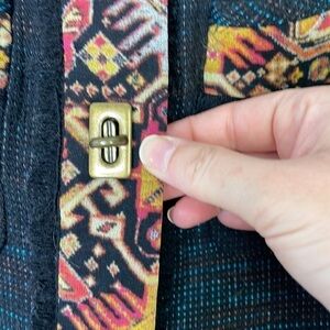 In good second hand condition gently worn. Minor wear. Two front pockets. Fringe trim. Metal twist clasps closure. Completely lined. Light build in shoulder pads. Measure lay flat: shoulder 14,5’’ bust 16’’ length 21’’ sleeve length 19’’.