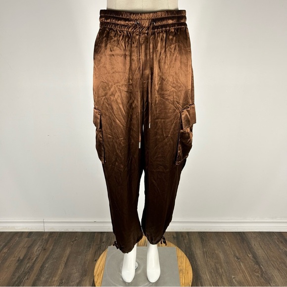 Elegant Rachel Zoe satin trousers in rich brown. Features elastic waistband.