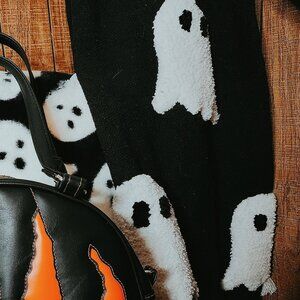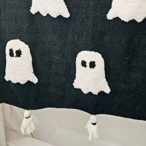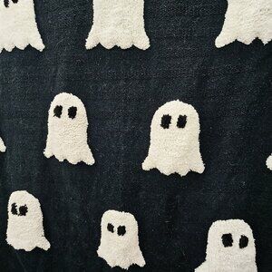Woven blanket with sherpa ghosts and tassels.