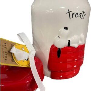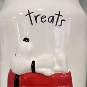New Rae Dunn x Peanuts Snoopy TREATS ceramic canister. Finely Glazed Ceramic with red lid