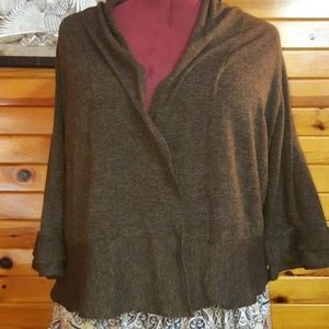 Nice brown shrug is polyester/spandex and features double cuffs and flattering style. Tag says 3X but it fits like a XL or 1X. 23" shoulder to hem. Open front.