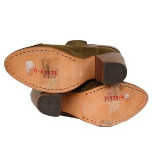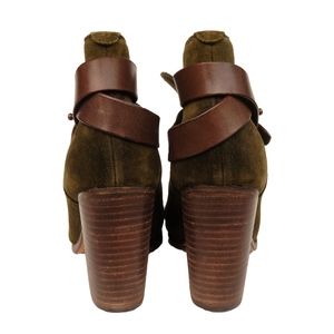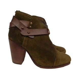 Rag & Bone Harrow olive green suede round-toe ankle boots, stacked heels and ankle straps with peg-in-hole closures at ankle straps. No original packaging.