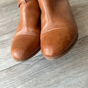approx. 5" shaft height with wraparound leather harness straps & peg-in-hole closure at ankles.