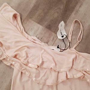 RAG & BONE/JEAN One Shoulder Ruffled Sequin Elasticated Waist Top Color is Peach