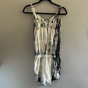 Stylish tie-dye romper. Features adjustable straps, elastic waist and pockets. Perfect for casual outings.