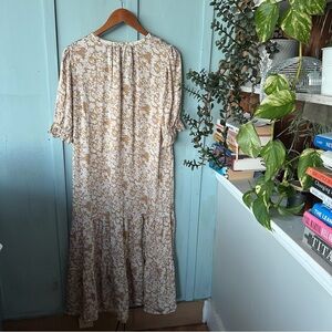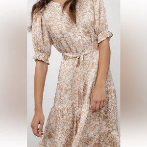 Elegant floral dress with puff sleeves and a tie waist. Features a delicate button-up front.
