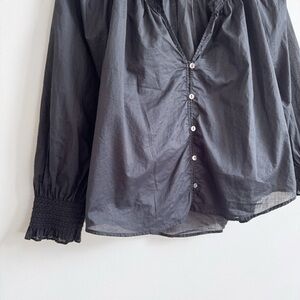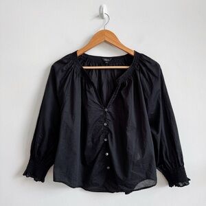 This pretty pullover top features natural shell buttons, elastic smocked detailing at cuffs, and a relaxed fit.
