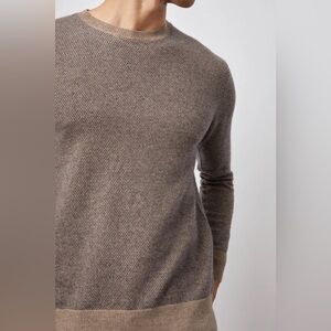Long sleeve, lightweight wool, crewneck sweater featuring two contrast heathered yarns in flax beige and navy blue. Elevated design, but still relaxed enough for everyday wear.