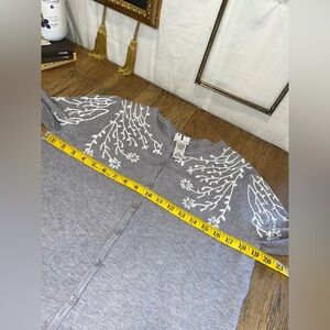 Elegant and feminine cardigan with delicate white floral embroidery on the shoulders and front. Soft grey knit, round neckline, and button-down closure. A refined piece that adds charm to both casual and dressy outfits.
