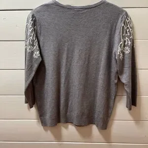 Elegant and feminine cardigan with delicate white floral embroidery on the shoulders and front. Soft grey knit, round neckline, and button-down closure. A refined piece that adds charm to both casual and dressy outfits.