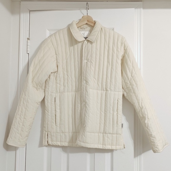 RAINS Liner Shirt Jacket. size xs unisex boxy fit, slight bigger close to s. off white color vertical quilted pattern. never worn.