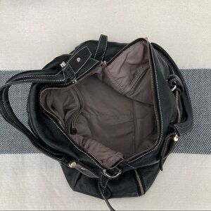 RAISA HEYS Soft Leather Bag Satchel. Can be used as an Overnight Bag or Carryon. Can also be used as a handbag or purse. Soft supple leather. Roomy. In excellent condition. Missing strap. Deep dark brown almost black. Many compartments. Safety latch at the front.