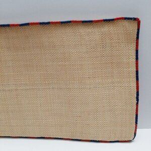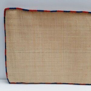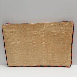 • Unique envelope style purse in natural cream raffia with red and blue bead details along the edge and top zipper closure. Lined.