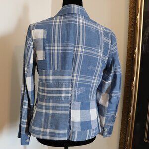 RALPH LAUREN , patch style jacket with very unique detail, fabric is linen, lined, slit front pocket flaps, excellent condition . Great jacket combination with jeans, or solid colour dress, or skirt PTP 19