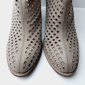 • Slip on ankle boots / shoes in taupey tan with geometric square laser cut-out design.