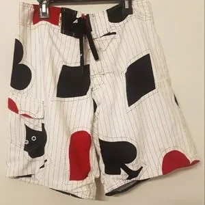 Vintage (1999-2001) pair of swimming trunks from defunkt skateboarder shop Randy River, with a large bold pattern of playing card suit symbols. They have a big pocket with a branded, waterproof, plastic sleeve for your cash etc. They have laces as well as velcro, and they are lined with net fabric. Very soft and comfortable fabrics.