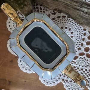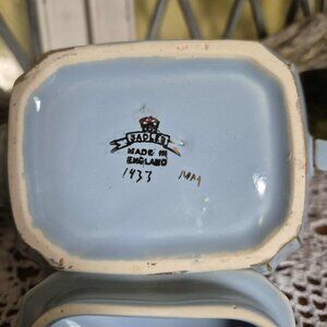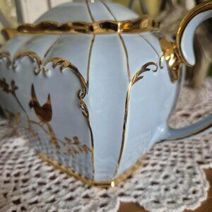 This gorgeous sky blue vintage 30s teapot is a rare find! Handpainted with 24-karat gold gildings, it is adorned on both sides with golden birds on a tree branch. I am not an expert, but I have not found its equivalent on the Internet. Sadler & Sons Ltd. is a world-renowned English pottery manufacturer synonymous with extraordinary quality and impeccable taste. Its products are highly sought after by serious collectors and are considered investments. This piece bears the golden seal "Sadler made in England", the model number 1433 and the artist's initials (MM).