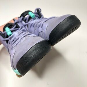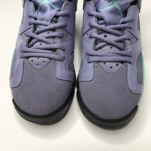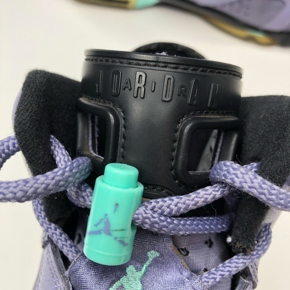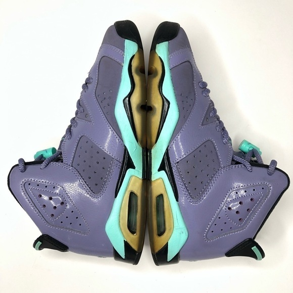 RARE SIZE ONLINE! Air Jordan by Nike 6 Retro GG in the color iron purple & bleached turquoise from the kids’-exclusive 2014 release. Saved By The Bell vibe. Released in 1991, Tinker Hatfield’s Air Jordan 6 was the shoe Michael Jordan was wearing when he claimed his first Championship title. In great used condition with a few flaws from normal wear/age (mainly dirty soles and yellowed rubber sole areas). See pics for details & measurements. Boy’s & girl’s youth size 4.5Y or women’s 6.