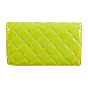 This is an authentic CHANEL Patent Quilted Wallet in Lime Green. This is a novel yet practical wallet by Chanel. It has all of the hallmarks of the Classic flap but in a smaller, clutch size. It comes in a bright green patent leather. The wallet has a medium flap. There is a CC snap closure. The interior has six card slots and bill slot. This is a stylish, novel wallet but it is also practical and you can carry currency and cards and also a few necessities safely at your side with a classic look, from Chanel.