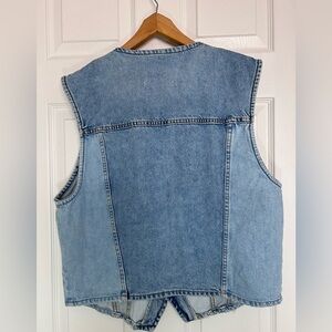 light blue denim vest with button closure. Features front pockets and sleeveless design.