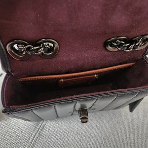 Rare Coach Quilted Madison 16 bag in the colour black. This was not sold in Canada, and I had to purchase from an American seller. I love the look of the bag so much, but I’m finding I grab other bags over this one now. In like-new condition aside from the small chipping of the black copper coating on the front closure, as pictured. Also has indented where the closure sits on the leather, as pictured. Has a black slip pocket, leather and chain strap that can be worn shorter and longer, internal back slip pocket, and card slots. Buttery soft leather.