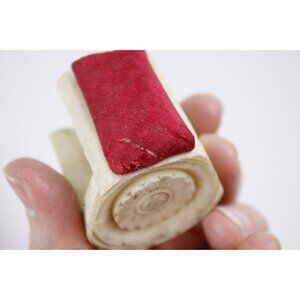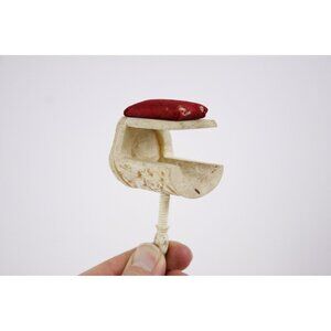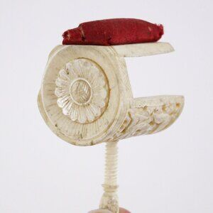 ...decorated Chinoiserie Canton sewing box accessory A decoratively carved oxbone Table C clamp with mounted pin cushion covered in red silk. The clamp has been delicately carved with flying birds and clouds to the bottom, and a flower to the side. In decent condition, with a repaired break on the side and some damage to the screw thread yet it looks to be working well. There is a bit of damage to the silk on top. It is max 3 -1/4 inches or 8 cm tall, and 1-9/16 inches or 4 cm wide – the table / surface to attach it to can be max 5/8 inches or 1.5 cm thick.