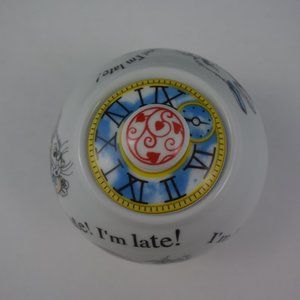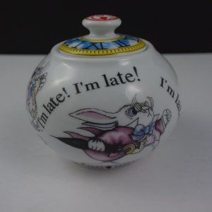 Ceramic sugar bowl with lid featuring charming illustrations of the white rabbit (I'm Late! I'm Late!) from Alice in Wonderland.