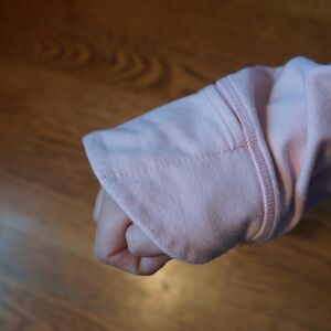 The fabric is SUPER soft. There a nice rounded tulip type hem at the waistline. A small hidden mesh pocket on the inside. ANNDDDD the best part of all, unlike newer sweaters that have a thumb hole...this sweater has a whole little flap that rolls over to cover your hand! *I tried to take pictures to show how the sleeves work but the easiest way to describe it is that its like the sleeves that roll over on baby clothing so they don't scratch themselves.