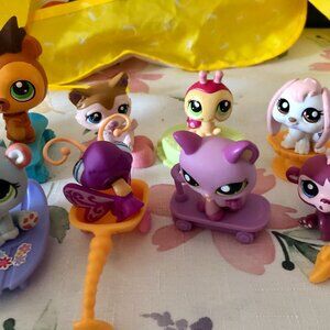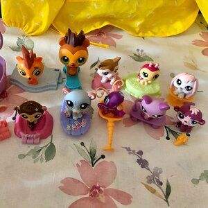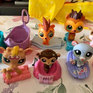 Bundle of 11 authentic Littlest Pet Shop figures, most of them with a base with accessories. Includes several rare G1 (first generation 2005–2008) pets highly sought after by collectors, such as monkey, giraffe, cat, and bear/hamster style figures. Mixed generations but many are vintage and harder to find.